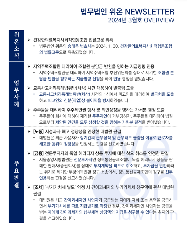 법무법인 위온의 최근 소식과 법률 이슈를 담은 2024년 3월 뉴스레터가 발행되었습니다.
