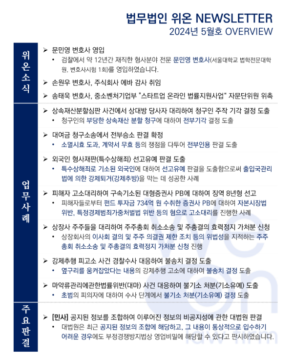 법무법인 위온의 최근 소식과 법률 이슈를 담은 2024년 5월 뉴스레터가 발행되었습니다.