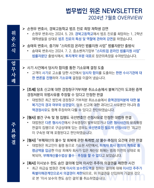 법무법인 위온의 최근 소식과 법률 이슈를 담은 2024년 7월 뉴스레터가 발행되었습니다.
