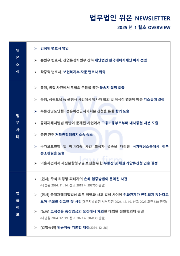 법무법인 위온의 최근 소식과 법률 이슈를 담은 2025년 1월 뉴스레터가 발행되었습니다.