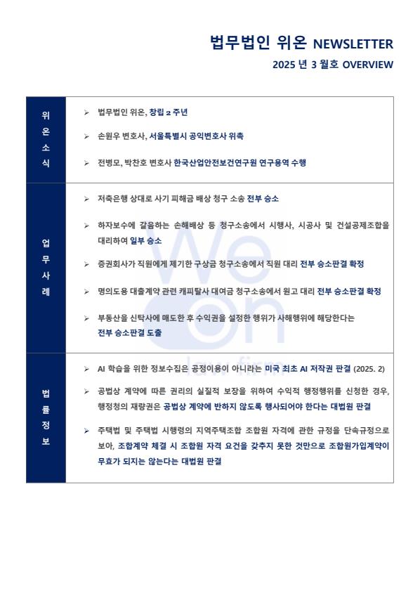 법무법인 위온의 최근 소식과 법률 이슈를 담은 2025년 3월 뉴스레터가 발행되었습니다.