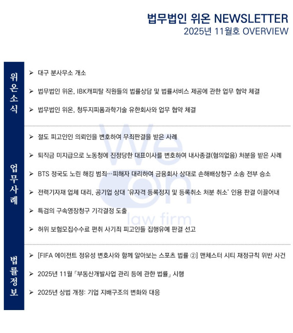 법무법인 위온의 최근 소식과 법률 이슈를 담은 2025년 11월 뉴스레터가 발행되었습니다.