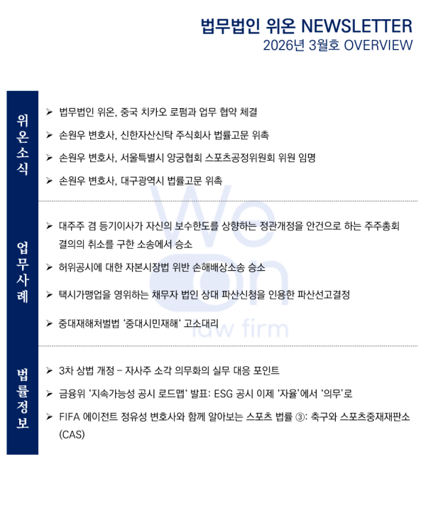 법무법인 위온의 최근 소식과 법률 이슈를 담은 2026년 3월 뉴스레터가 발행되었습니다.